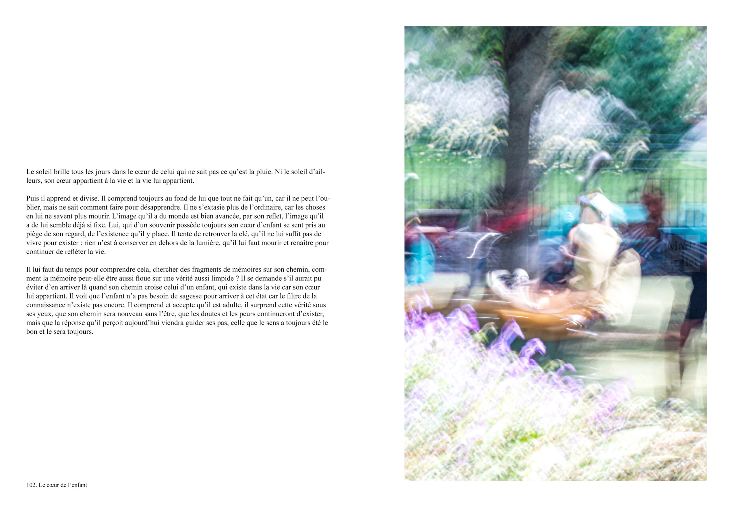 Ce livre est un recueil de textes étalé sur presque vingt ans d’écriture, ceux qui ont vu le jour avant que je découvre la photographie. Une recherche chaotique et obsessionnelle que je déversais par les mots. Ce livre est une mise en lumière d’un passé. Un cheminement, qui raconte la vie par ce qui a traversé la mienne, mis en forme par l’image.